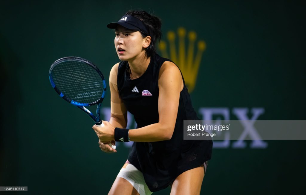 INDIAN WELLS, CALIFORNIA - MARCH 12: Xinyu Wang of China in action against Barbora Krejcikova of the Czech Republic in her third-round match on Day 7 of the 2023 BNP Paribas Open at the Indian Wells Tennis Garden on March 12, 2023 in Indian Wells, California (Photo by Robert Prange/Getty Images)