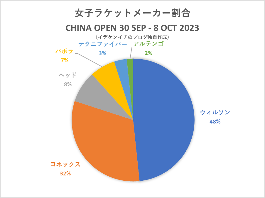 女子はもっと極端で、ウィルソンだけで半分をしてめています。その次にヨネックスとなっていてヘッドとバボラが追うようになっています。こちらも4大メーカーで95%を占めています。