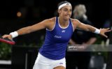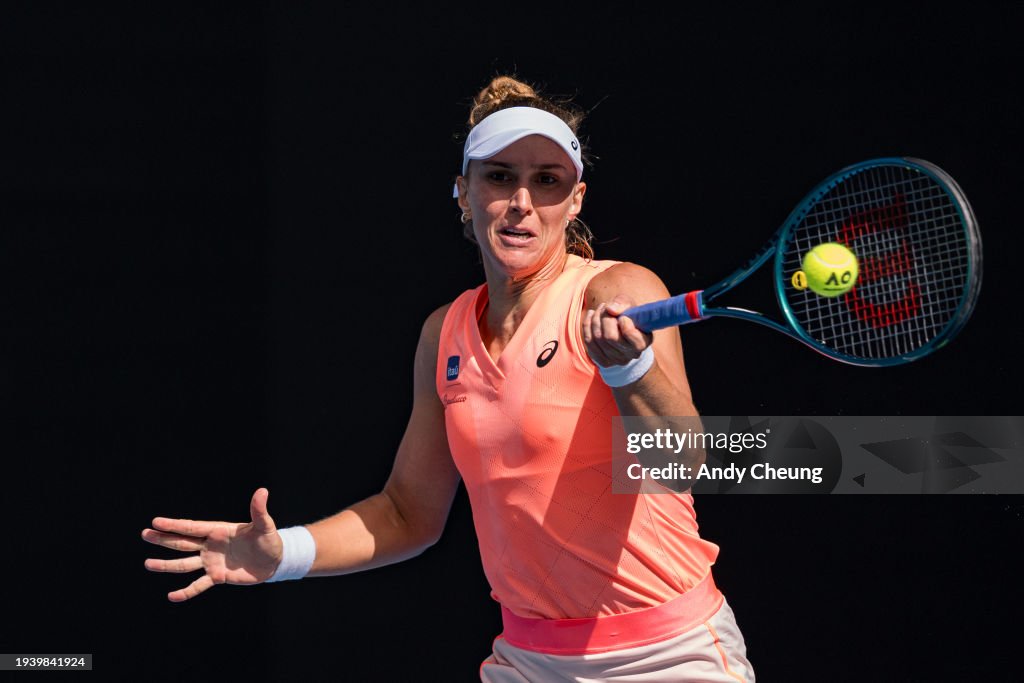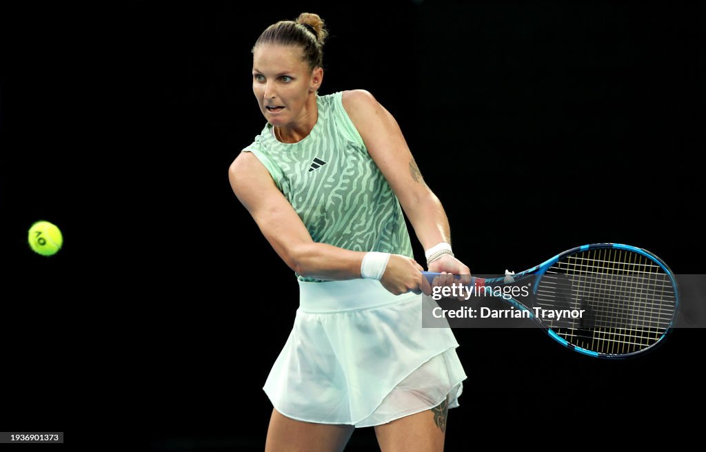MELBOURNE, AUSTRALIA – JANUARY 16: Karolina Pliskova of the Czech Republic plays a backhand in their round one singles match against Elena Rybakina of Kazakhstan during the 2024 Australian Open at Melbourne Park on January 16, 2024 in Melbourne, Australia. (Photo by Darrian Traynor/Getty Images)