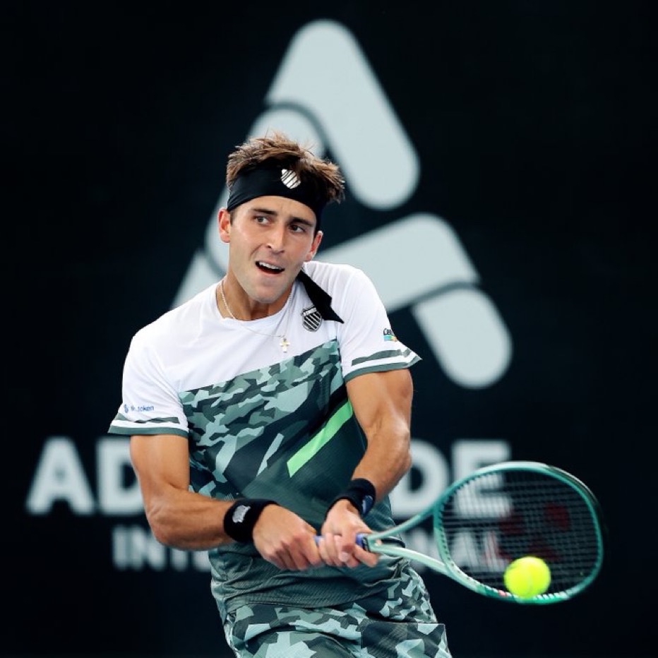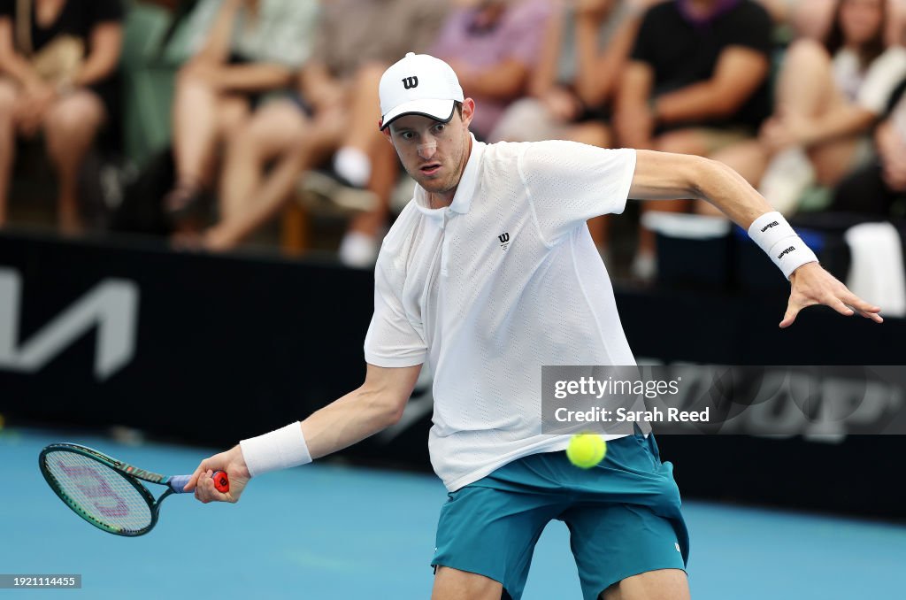 ADELAIDE, AUSTRALIA – JANUARY 10: Nicolas Jarry of Chile plays a forehand in their match against Matteo Arnaldi of Italy during day three of the 2024 Adelaide International at Memorial Drive on January 10, 2024 in Adelaide, Australia. (Photo by Sarah Reed/Getty Images)