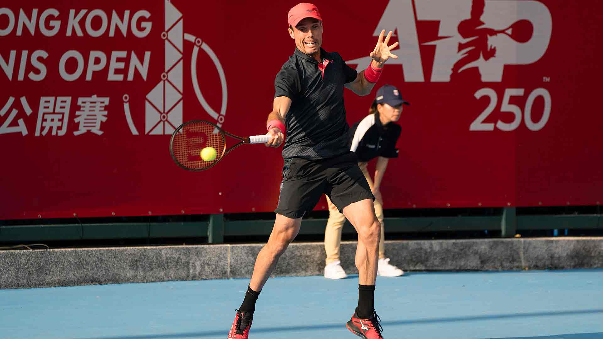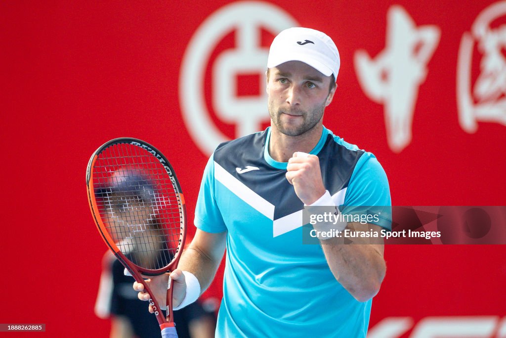 HONG KONG, CHINA – DECEMBER 31: Liam Broady of Great Britain celebrates a point against Aziz Dougaz of Tunisia during the day one of the Bank of China Hong Kong Tennis Open 1st round qualifying at Victoria Park Tennis Stadium on December 31, 2023 in Hong Kong, China. (Photo by Yu Chun Christopher Wong/Eurasia Sport Images/Getty Images)