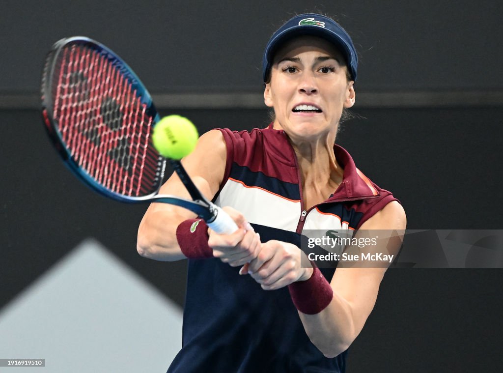 ADELAIDE, AUSTRALIA – JANUARY 08: Bernarda Pera of the USA plays a backhand during their match against Paula Badosa of Spain in the 2024 Adelaide International at Memorial Drive on January 08, 2024 in Adelaide, Australia. (Photo by Sue McKay/Getty Images)